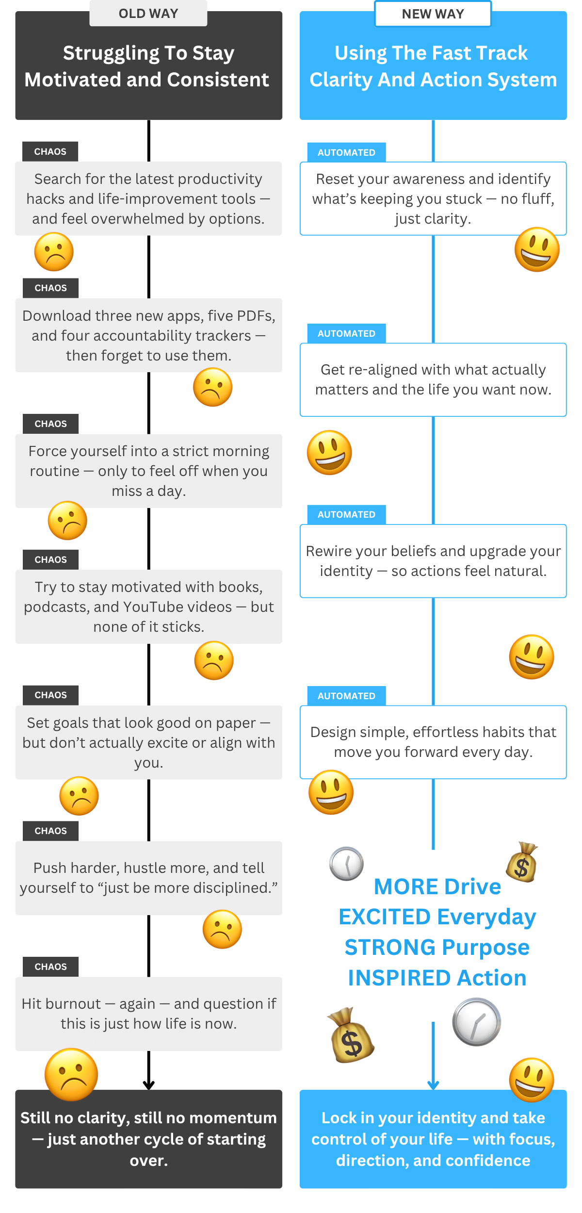 That’s what led me to develop The Fast Track Clarity And Action System — a simple 5-step process that targets the real root: who you believe you are. And when that shifts? Everything else falls into place.